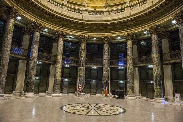 The eastern facade is adorned with a portico of Corinthian columns made of Indiana sandstone. The walls are faced with limestone, accented with pink granite and soft red copper. The main entrance features massive bronze doors, designed in 1921 by White’s son, Lawrence Grant White. These doors consist of eight relief panels created by six sculptors.