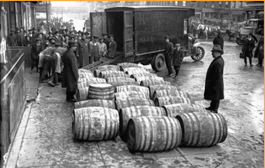 Началась Первая мировая война. США в нее вступили в 1917 г. Пытаясь сохранить зерно для питания населения, в этом году Конгресс принял восемнадцатую поправку к Конституции о введении «сухого закона». В том же году было прекращено производство виски, а в 1919 г. пива. Закон вступил в силу в 1920 г. Он запрещал изготовление, продажу и перевозку алкоголя в пределах страны. Кроме поправки, Конгресс принял Закон Волстеда, чтобы уточнить определенные детали запрета алкоголя. Президент Вудро Вильсон ветировал этот законопроект, но Конгресс его преодолел, а на следующий день за него проголосовал и Сенат. По этому закону было установлено юридическое определение алкоголя и указано, какие штрафы должны платиться за его производство.
